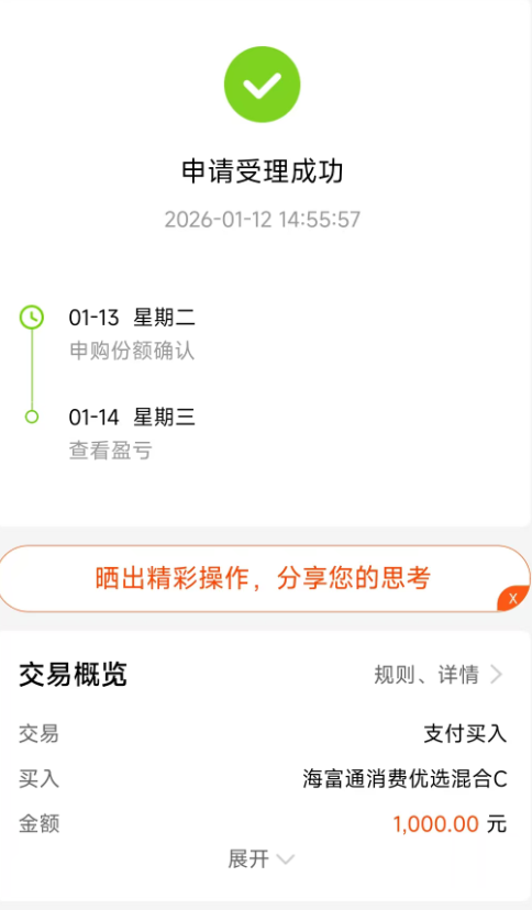 家人们,万万没想到啊,去年满4000-100的大盘,今年这么猛,一鼓作气冲上了4000点,继续冲上了4100点,一点都不带回调继续上涨,成交额大幅放量,投资情绪高涨啊!之前追卫星、半导体等热门赛道的小伙伴,已经赢麻了,接下来我要进场低估消费板块,今天加1000$海富通消费优选混合C(OTCFUND|010422)$,这只基金基金秉持灵活轮动策略,重仓新消费与优质传统消费的龙头企业,精准贴合 “精明消费”“体验型消费” 升级趋势,既受益于智能家电、健康消费等政策红利赛道,也把握年货采购、返乡出行等旺季需求。