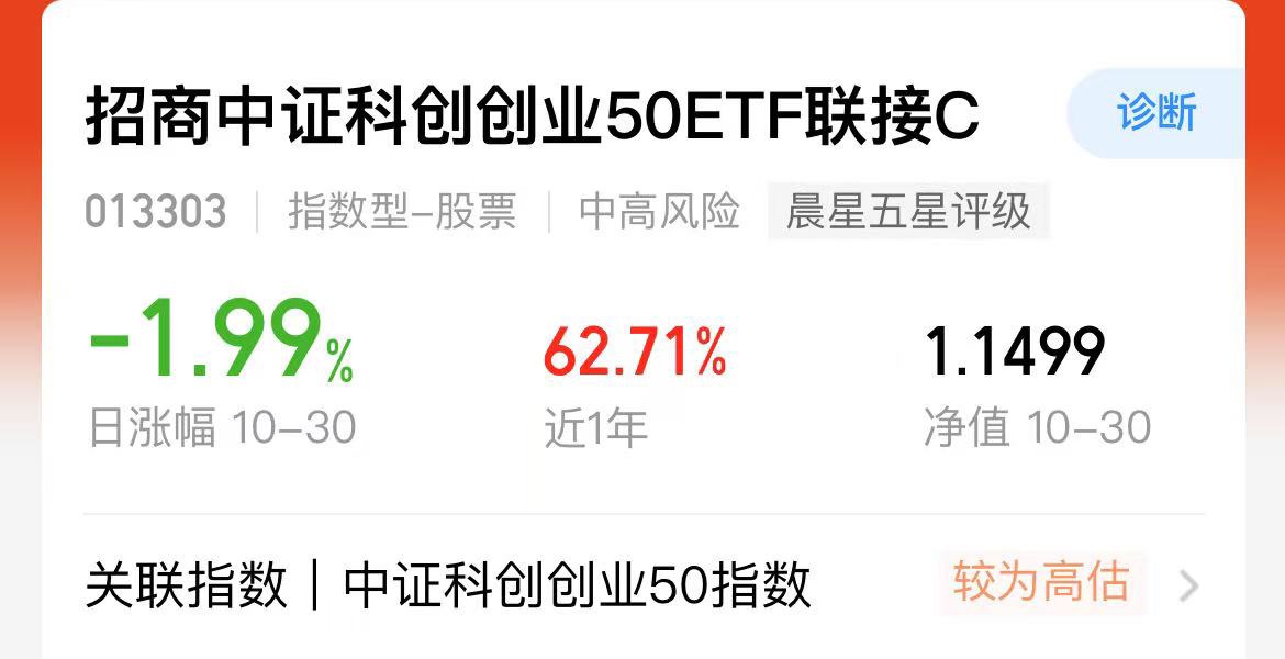 今天这行情得提提$招商中证科创创业50ETF联接C$ 最新净值1.1499,10月30日跌了1.99%,但从成本角度看它真的很能打。C类份额没有申购费,销售服务费才0.4%,比不少同类基金都低,短期周转或者长期持有都划算。