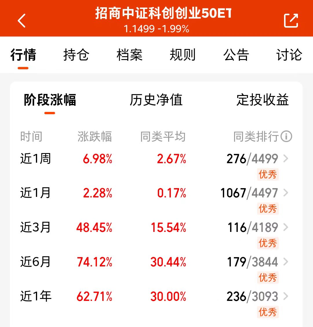 10月最后一个交易日了,大盘指数低开低走,行情震荡,科技板块细分多,轮动明显,但是在“十五五”的规划下,电力、电子等国家未来发展的关键领域还是值得期待的。$招商中证科创创业50ETF联接C(OTCFUND|013303)$,近三个月上涨48.45%,远高于同类平均水平,我看好接下来的行情。持续关注。