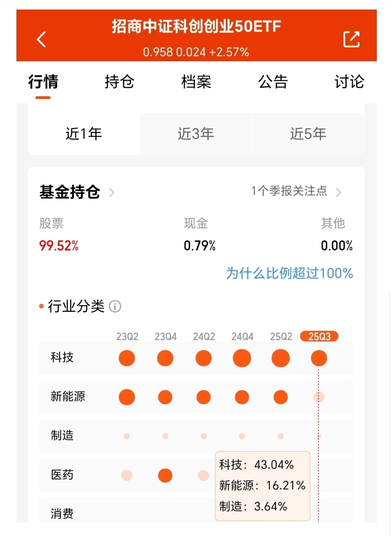 我关注的招商中证科创创业50ETF联接C配置比较均衡,电子占40%,电力设备22%,通信20%,医药生物9%,覆盖了科技领域的主要方向。虽然短期可能有波动,但长期来看还是值得期待的。