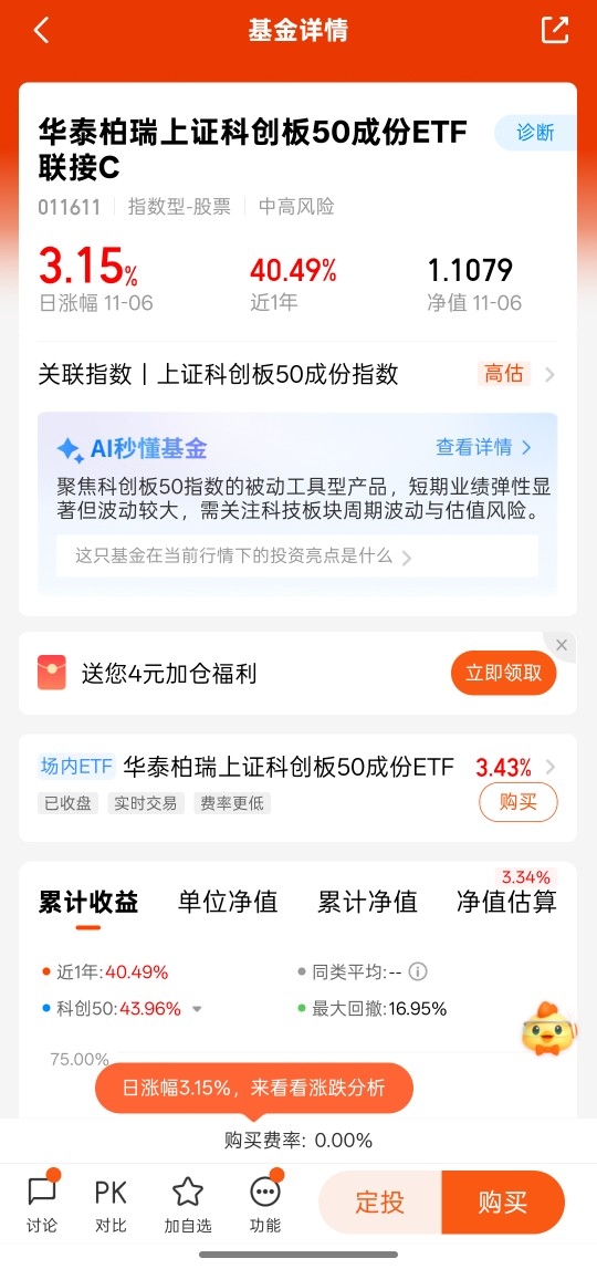 谁懂啊!今天科创50直接走出独立行情,大涨3.34%,一扫之前几天的震荡阴霾。看着半导体、人工智能这些板块集体发力,真后悔没早点布局科技赛道。不过还好发现了华泰柏瑞的好东西,不用凑50万门槛,几百块就能参与科创板投资,对于咱们小散户来说太友好了。它紧紧跟着科创50指数走,指数涨它就涨,不用自己研究财报、分析行业,省了超多功夫。C类基金还没申购费,持有超过7天赎回费也免了,平时可以用闲钱定投,跌了补点仓,涨了就落袋为安,这种灵活又省心的投资方式,太适合想蹭科技风口又怕风险的人了~