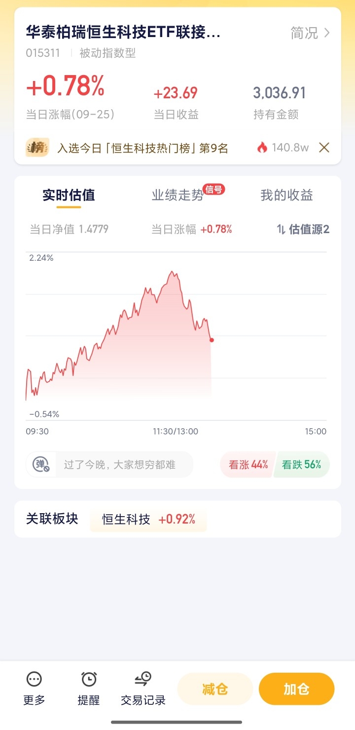 恒生科技今天低开高走,最终涨了2.53%,从52周最低的3907点到现在的6323点,这波反弹的力度确实不小,科技板块的回暖趋势挺明显的。想布局这个板块的话,华泰柏瑞的相关产品可以重点看看,它近半年虽然有波动,但整体收益能到8%以上,近一年更是直接冲到50%多,跟住板块长期趋势的能力很强。不过千万别忘了,这是中高风险产品,市场一旦回调可能会有亏损,投资前一定要做好风险评估。$华泰柏瑞恒生科技ETF联接(QDII)C$