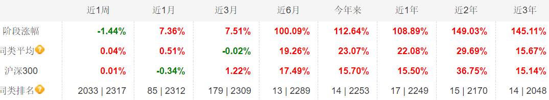 近2年、近1年、近6月及今年来涨幅均超100%,均大幅跑赢同类平均,超额收益非常显著。