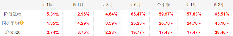 今年来大涨近60%,跑赢同类平均超33%。看好其中线潜力,昨天刚加过一笔,下周找机会继续低吸。