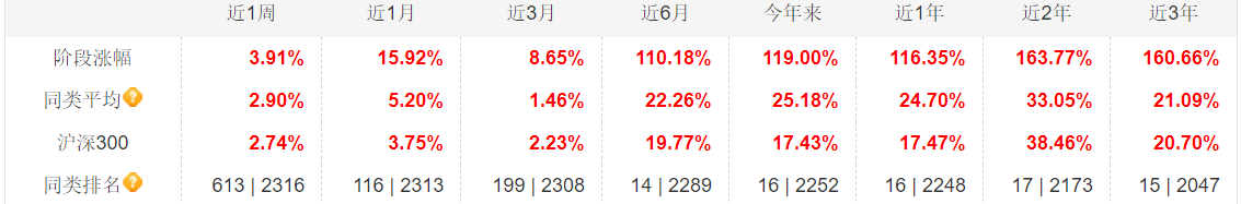 近3年大涨160.66%,跑赢同类平均超139%,超过99%的同类产品。近2年、近1年、近6月、今年来等时段均大幅跑赢同类平均收益,市场排名均居前1%,不得不说这业绩是真的不错。