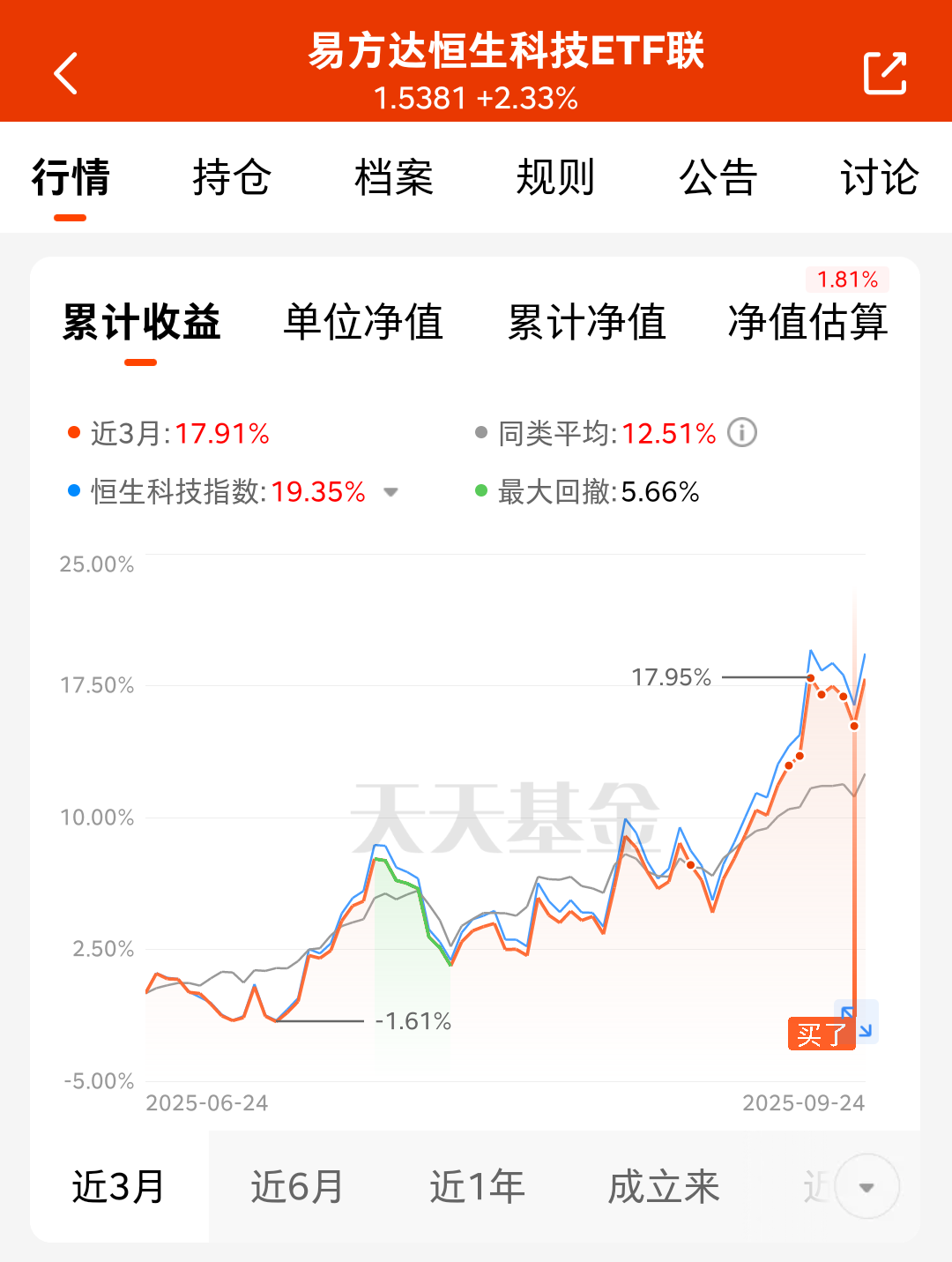 伙伴们,还有4个交易日9月就结束了,大家有什么打算呢,从当前情况来看港股恒科相对A股科技仍然滞涨,无需恐高,而且港股十一不休市,过去10年国庆期间港股上涨概率高,可提前关注$易方达恒生科技ETF联接(QDII)C(OTCFUND|013309)$我上车的就是这只。