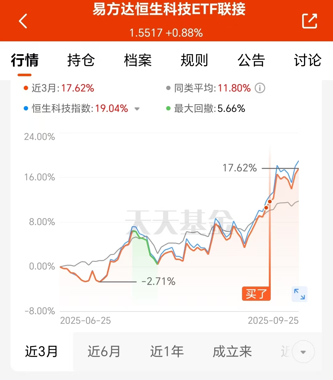 大伙别觉得恒科现在高,跟 A 股科技比起来,它还没怎么涨,这种恐高就有点没必要啦。而且十一假期间港股不放假,过去 10 年这期间港股涨的概率还挺高的。$易方达恒生科技ETF联接(QDII)C(OTCFUND|013309)$紧密跟踪恒生科技指数,昨天上涨0.88%,近三个月上涨17.62%,业绩涨幅不错。眼下恒指也有再创阶段新高的势头,我今日也继续布局,提前蹲国庆行情。