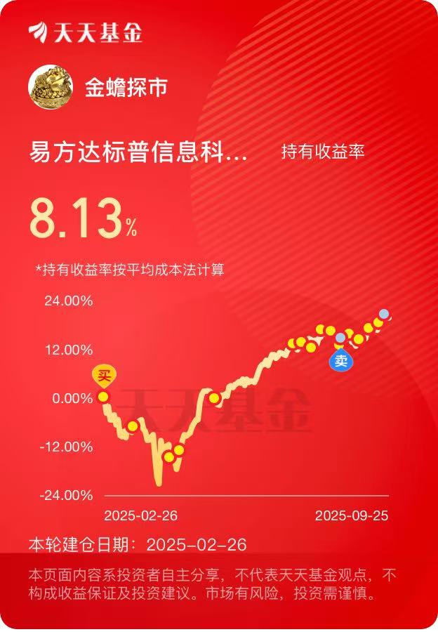 基于此,我四季度的规划趋于谨慎乐观。对于标普信息科技这只QDII基金,四季度全球科技股波动可能加大,我会选择持有观望,不再追加高风险仓位,耐心等待美股调整后的加仓机会。而对于国开债指数,其与经济增长负相关的特性是对冲经济不确定性的良好工具,我将继续持有作为核心防御。整体上,我会保持股债均衡,利用债券的票息收入来增强组合的稳定性,以静制动,为明年布局积蓄能量。@易方达基金