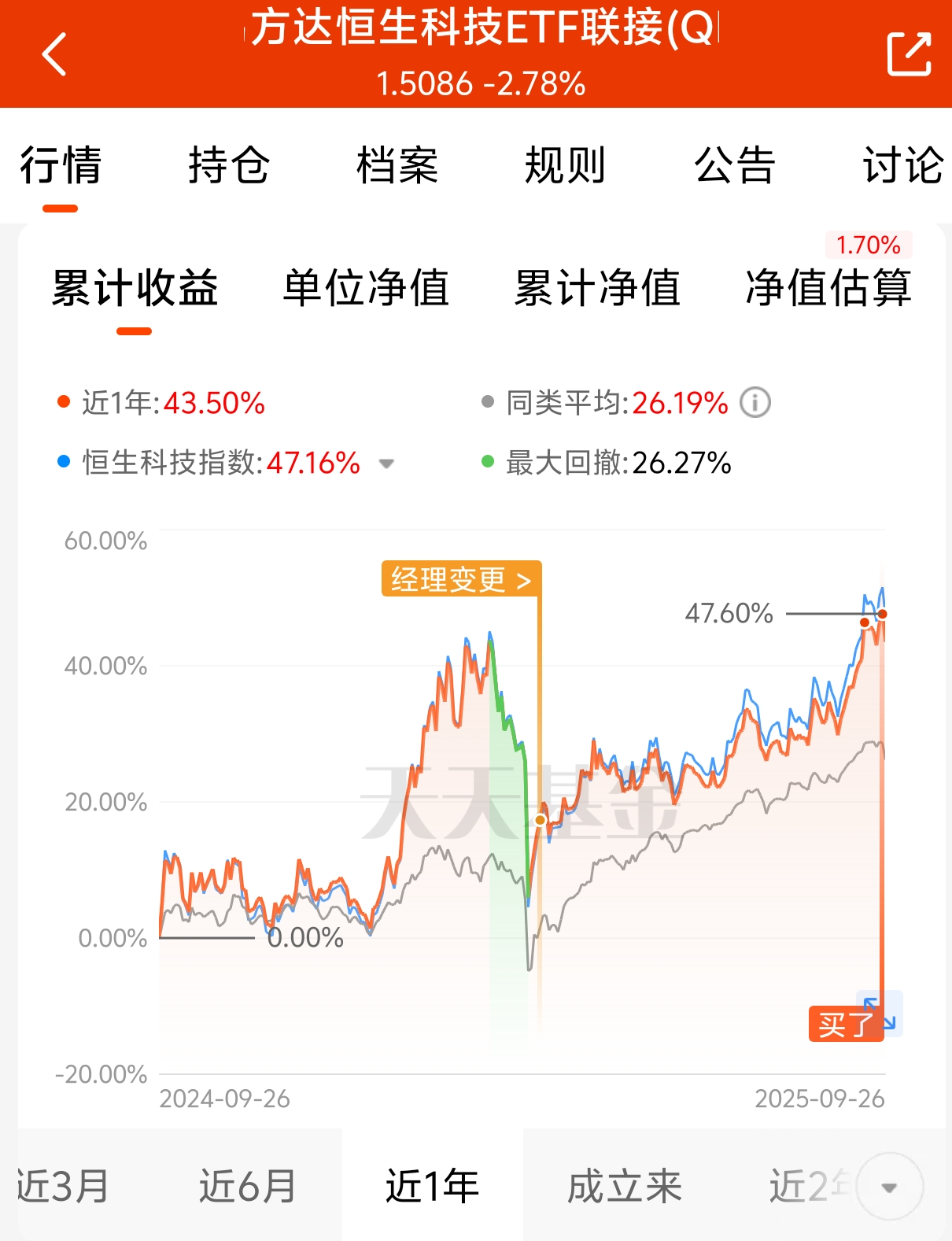 $易方达恒生科技ETF联接(QDII)C$ 经过上周五的大调整,今天a股和港股走出全线修复行情!美联储降息靴子落地,增加了市场流动性,每一次的降息都有一波强势的反弹,今天稳住走势又是美美的一天,目前恒科指数涨幅1.92%,港股恒生科技成长性好,弹性高。市场行情回暖,今天继续定投走起,国庆期间还可以吃港股涨幅哦!