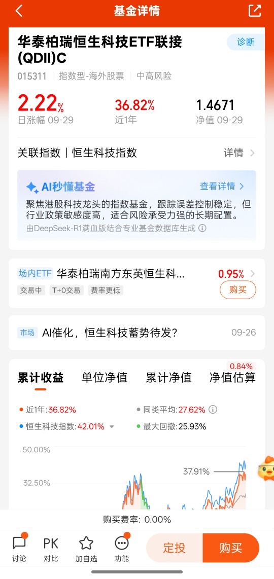 今天和股友聊天,满屏都是恒生科技的好消息,这板块真是彻底回暖了!核心原因就是咱们科技产业升级了,从互联网应用转向芯片、量子计算这些硬科技,技术壁垒越来越高,机构都在加仓 。但个股波动实在大,怕选错的可以看华泰柏瑞,它专注恒生科技赛道,持仓都是经过市场检验的龙头企业,近期跟着指数一路涨,收益特别可观。不用自己盯盘研究,跟着专业工具走就行。不过市场有风险,投资要量力而行,得根据自己情况来。