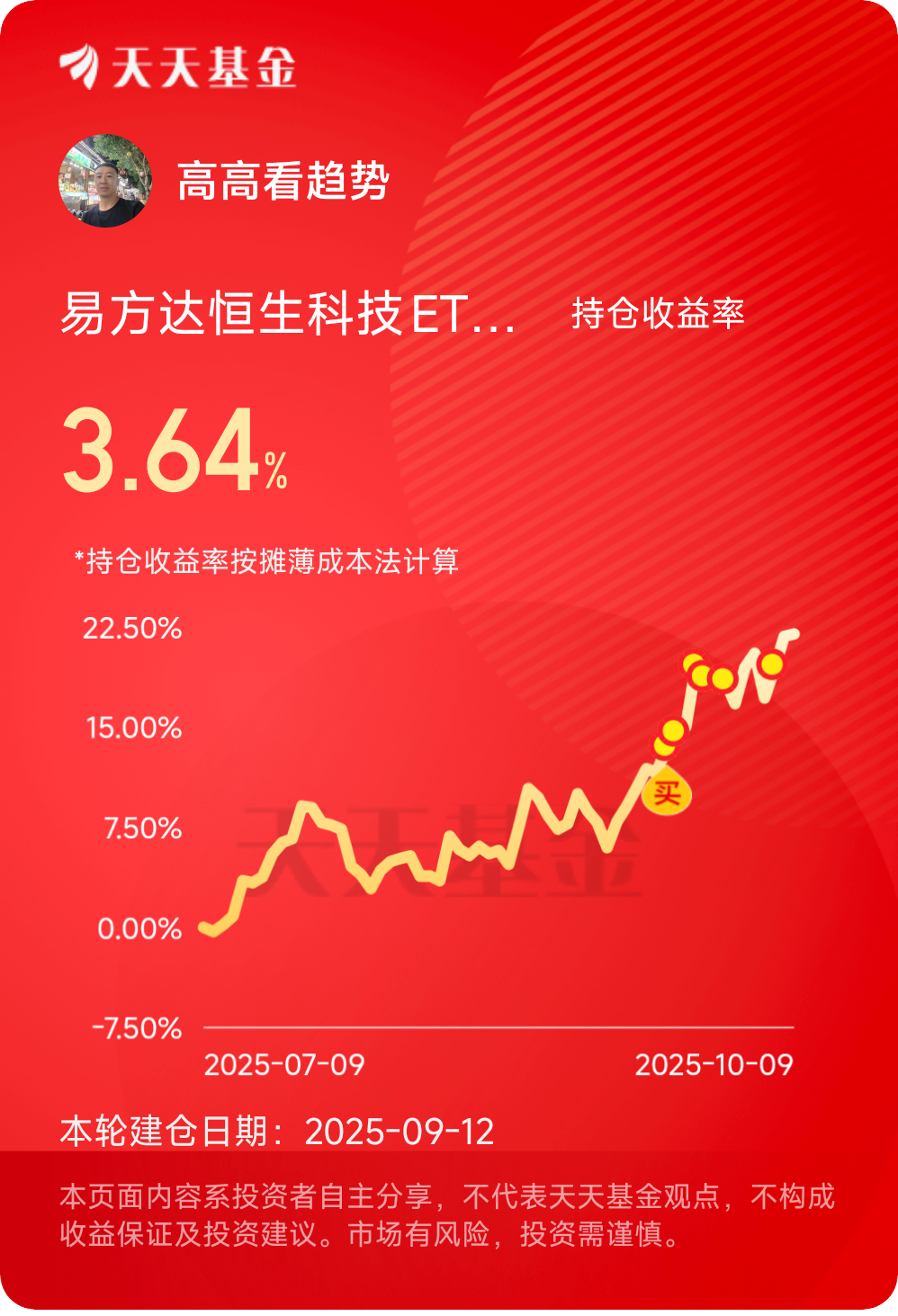 今天市场迎来调整。主要受到外围影响。连续上涨的港股也迎来了回落。虽然恒生科技指数出现了调整,但是目前整体上涨的趋势还没有变。美联储10月降息的预期还在升温。外资有望再度加速回流。而且对比a股,港股科技目前估值低。性价比高。未来的补涨空间依然还比较大。今天我决定继续布局持有的$易方达恒生科技ETF联接(QDII)C$ 紧密跟踪恒生科技指数,跟踪的精准度高。同赛道长期做到了优秀。而且费率方面同类也是比较低。我坚定看好四季度的突破表现。今天趁着回调继续定投。