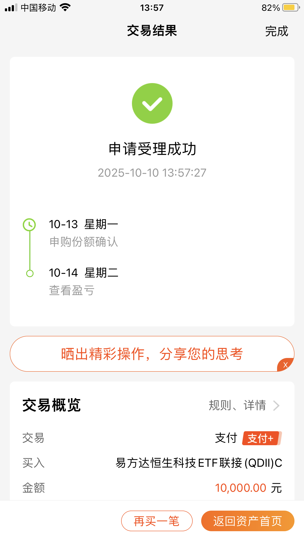我自己的观点,在众人都恐慌的时候,大胆珍惜这次倒车接人的机会。基本的逻辑就是,这次科技的行情还远没有结束,上涨的过程,总是有各种挖坑,一旦坑挖好了,认准了,就要敢于加仓。趁着调整,今天继续上车$易方达恒生科技ETF联接(QDII)C(OTCFUND|013309)$,1000元。