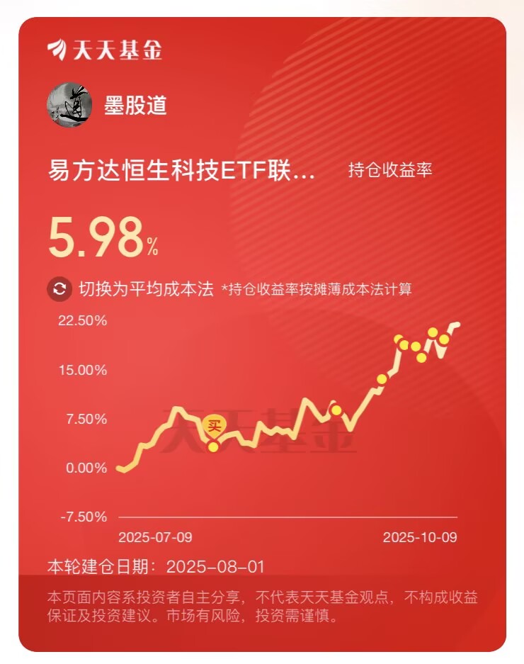 A股今天调整的多是前期涨太猛的股,两市还是涨多跌少,没明显恐慌,不用慌。恒生科技今日调整不少,现在位置合适,有修复机会。 $易方达恒生科技ETF联接(QDII)C(OTCFUND|013309)$能跟踪板块,覆盖港股科技龙头,C类免申购费,持有时间短也划算。市场波动本就是机会,10月降息首选港股,我想布局恒生科技的,这基可以慢慢低吸!