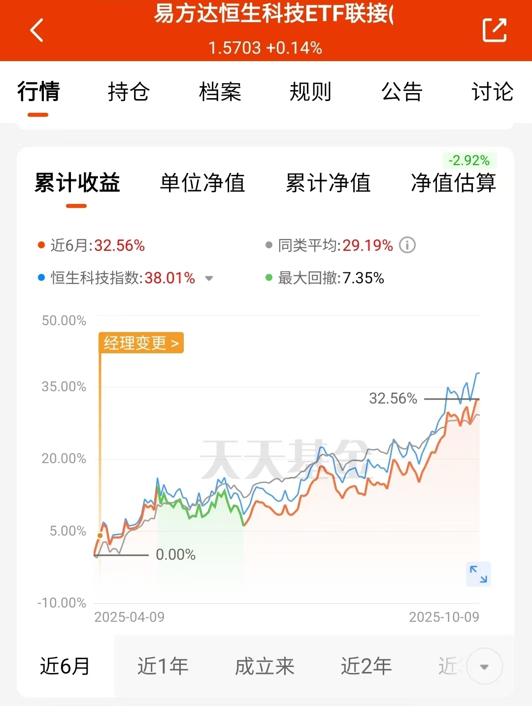 美联储降息已经差不多有一个月了,利好逐渐凸显,据目前情况看10月美联储仍可能降息,外资可能进一步回流港股,港股科技将继续受益,而且横向对比A股美股,港股科技仍然在估值洼地;更加适合逢低加仓。我选了$易方达恒生科技ETF联接(QDII)C(OTCFUND|013309)$,有兴趣的伙伴也可以选择这只呢。
