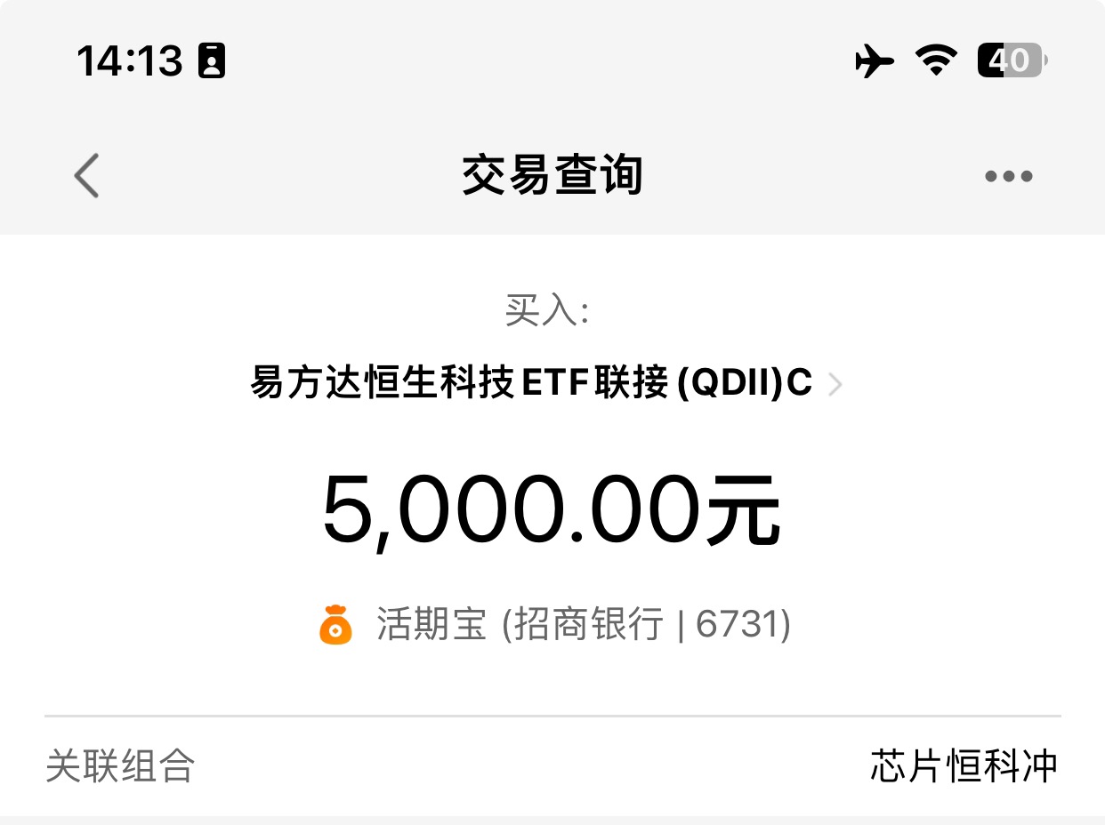 今日加仓5000元易方达恒生科技(013309),$易方达恒生科技ETF联接(QDII)C$ 今天真是跌麻了,但又有点兴奋,还是越跌越买的逻辑,大跌几天,迅速跌到位,然后又能愉快的慢慢上涨了。港股科技属于外部市场中弹性最大的一批资产,波动大是正常的,所谓盈亏同源,涨幅也会很大。如果低位不敢加仓,那么上涨的时候就吃不到大肉。我们想想最终逻辑,腾讯能不能新高?阿里的AI是不是国内最优秀的,股价是不是跌多了?美团真的那么弱吗?中芯国际能不能挑战台积电?对我来说,这些答案都是肯定的,只要方向是确定的,过程中的波动就可以忽略,有明显的机会就做做波段,有便宜的机会就捡筹码,投资可以很简单。我的预期收益是50%,没有达到目标前我都不会减仓。