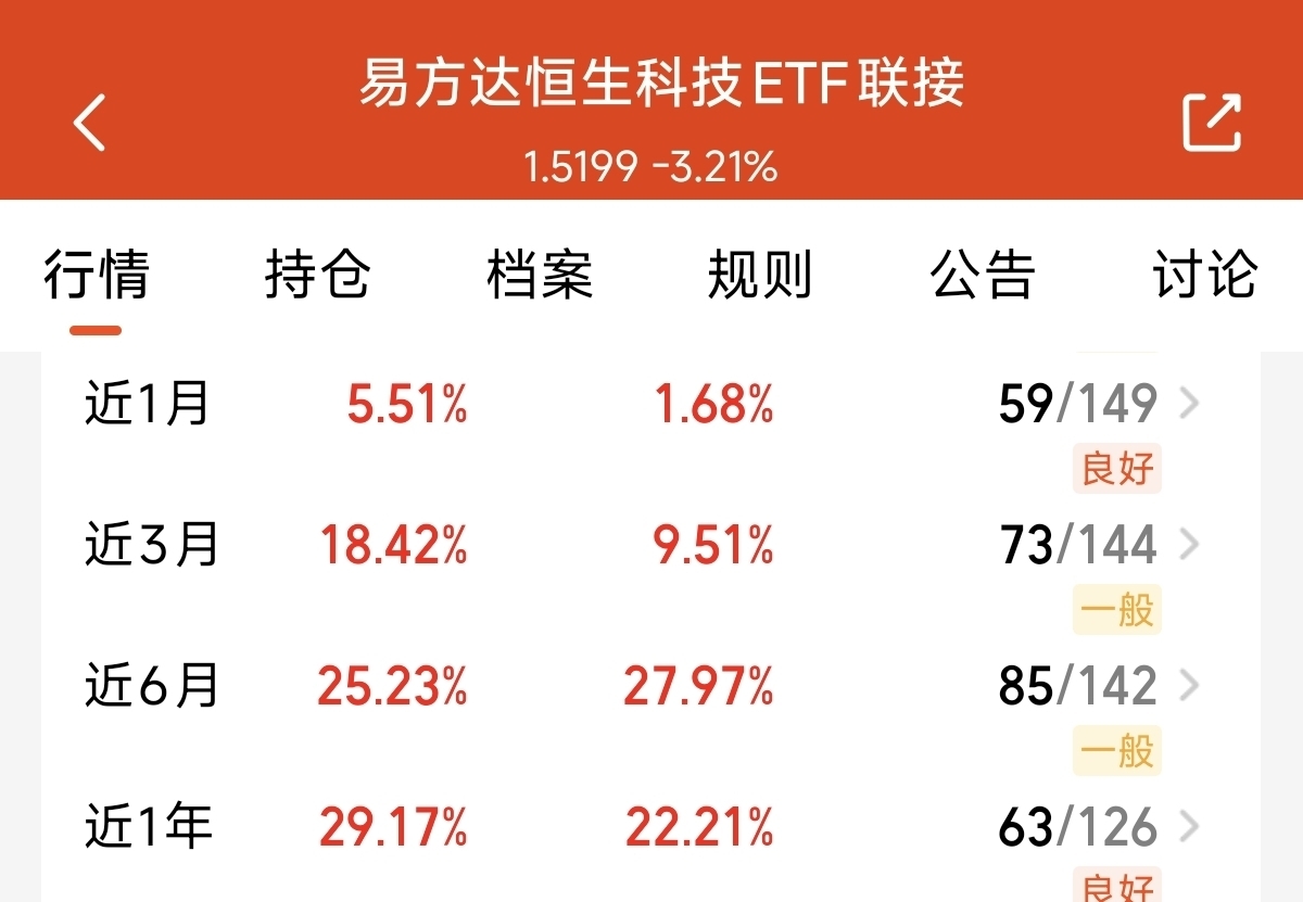 三大指数今天迎来调整。港股早盘回升之后,尾盘再度回落。不过明显可以看到,对比上一次的风波来袭。恒生科技指数今天表现的明显还是比较稳。而且目前美联储10月大概率继续降息。也是利好港股修复上涨。当前恒生科技在全球科技指数中估值还比较低。未来修复上涨的空间比较大。我坚定看好未来的突破上涨表现。趁着今天倒车接人,我继续采用定投的方式补仓$易方达恒生科技ETF联接(QDII)C$ ,紧密跟踪恒生科技指数表现好,近3月上涨了18.42%。大幅跑赢的同类平均业绩。而且费率方面也比较低。继续看好再突破。