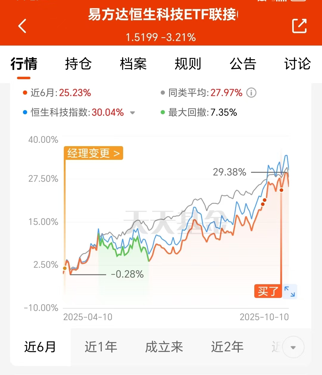 受外部因素干扰,今天A股和港股都低开调整了,不过我觉得这个是低吸布局的机会。老美10月份仍然有降息的可能,外资将加速回流港股市场;而恒生科技相对高位的美股来说,港科技板块估值相对较低,适逢今天回调幅度较大,我打算逢低布局$易方达恒生科技ETF联接(QDII)C(OTCFUND|013309)$,这个是紧密跟踪恒生科技指数的,近六个月业绩涨幅25.23%,表现不错,港科技板块估值修复空间不小,我继续看好呢。
