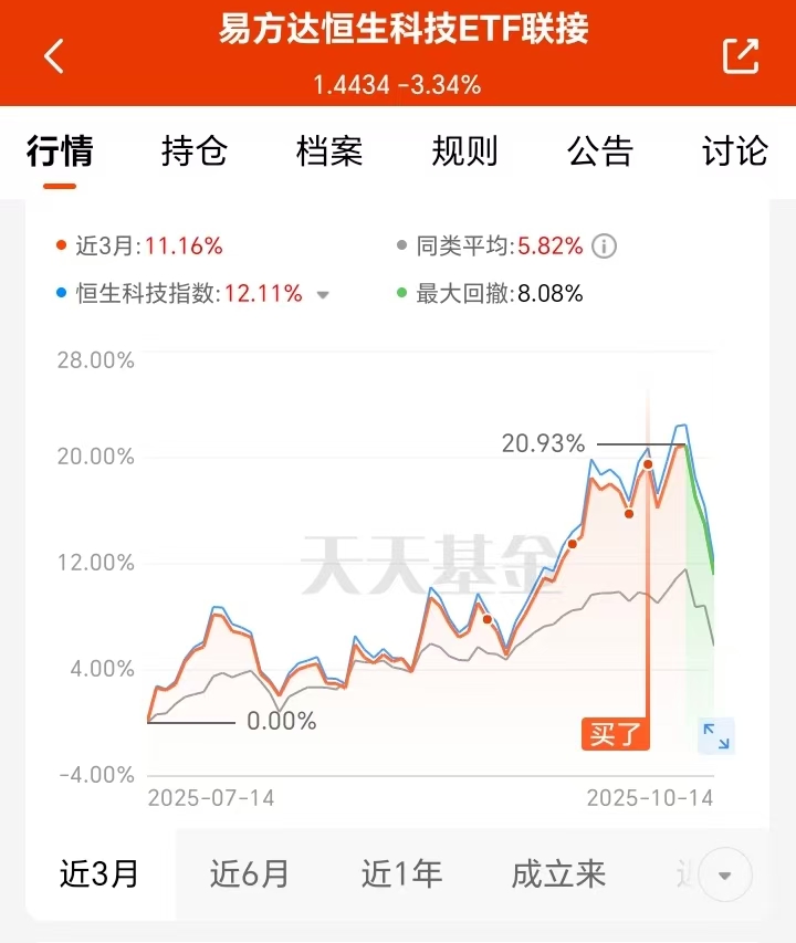 今天A股市场盘中走势震荡,港股市场今天高开高走,表现不错,行情开始修复啦。经过好几天的调整,港科技目前位置性价比不错,中长期来看,港科技比A股和美股的估值更低,也是有补涨机会的。$易方达恒生科技ETF联接(QDII)C(OTCFUND|013309)$紧密跟踪恒生科技指数,偏差较小,这基近3个月上涨11.16%,业绩也还不错,今天我也逢低布局起来。