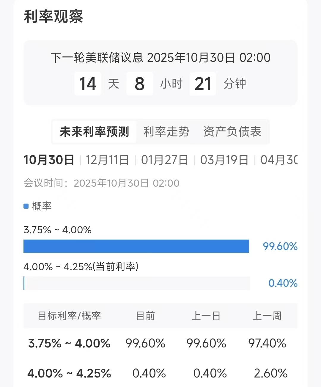 从降息概率来看,达到99.60%,也跑不了的,哈哈我准备好吃肉了