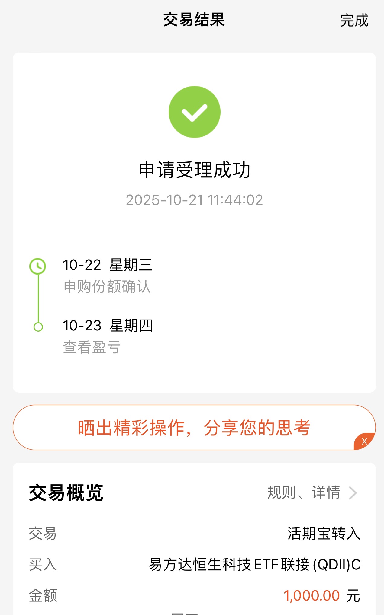 恒生科技经历多日调整后,港股科技今天终于迎来反弹!我趁势加仓1000元,继续埋伏这个长期看好的方向。相较A股、美股,港股科技整体估值依然处于低位,许多核心资产已进入历史性价比区间。近期资金面上也出现积极信号——南向资金连续多日逆势流入,说明聪明钱已提前布局。考虑到10月美联储降息预期渐强,流动性改善有望为港股科技带来新一轮修复行情。趁调整低位布局,后面补涨空间或许比想象中更大。