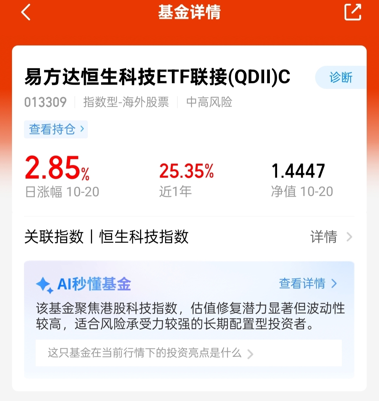 我现在拿着$易方达恒生科技ETF联接(QDII)C$ ,今天估值又涨了2.8%。对比美股科技股,港股科技板块估值还是低不少,性价比更高。现在美联储已经开始降息周期,这对港股是利好。我觉得港股科技股的行情可能才刚开始,准备继续持有看看。