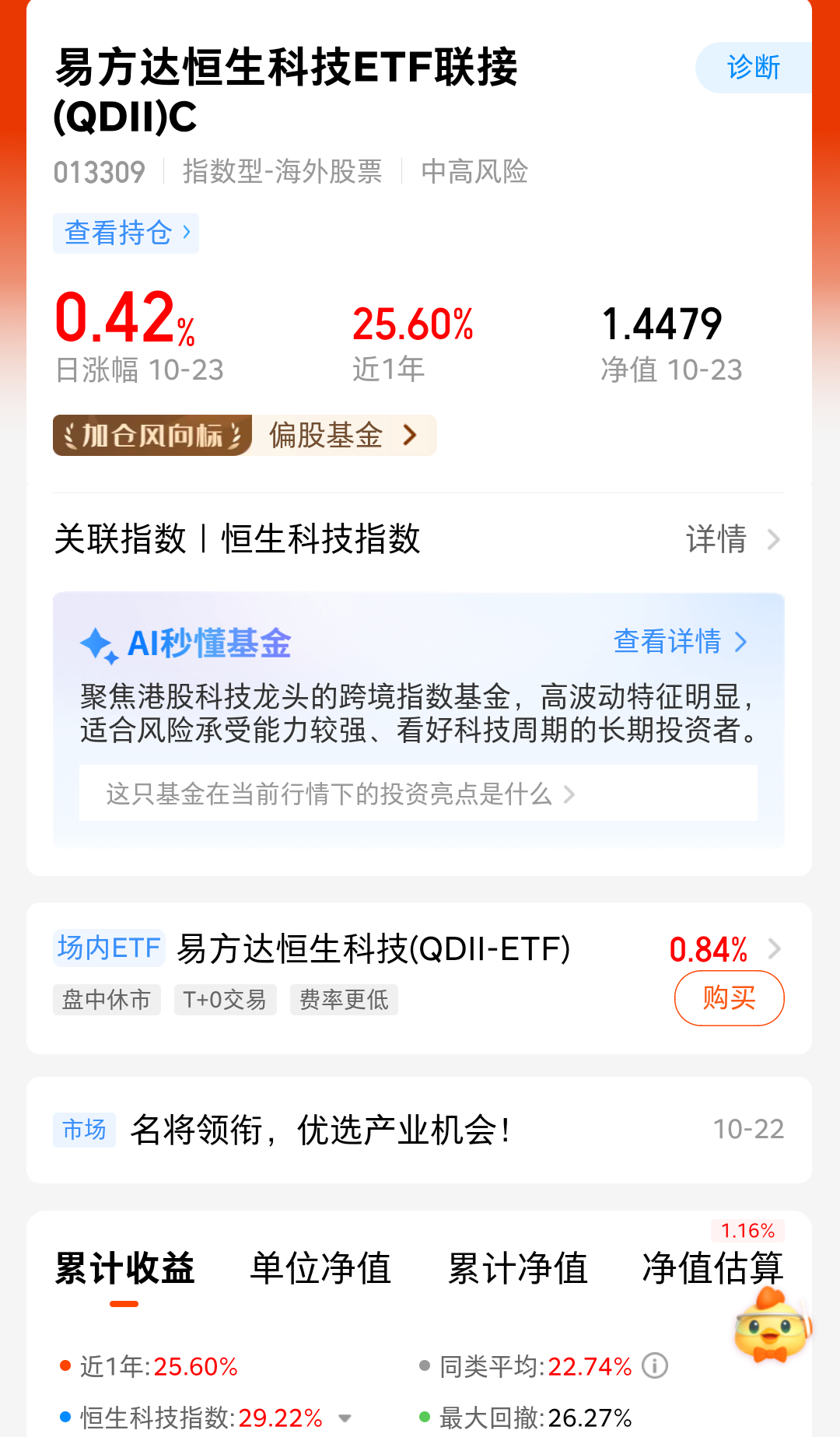 这周最后一个交易日啦,大盘指数高开高走,反弹行情,不过这周股市还是有些震荡,经过调整,港股科技今天开始反弹啦。中长期看港股科技比A股美股补涨机会更大,我继续加仓$易方达恒生科技ETF联接(QDII)C(OTCFUND|013309)$