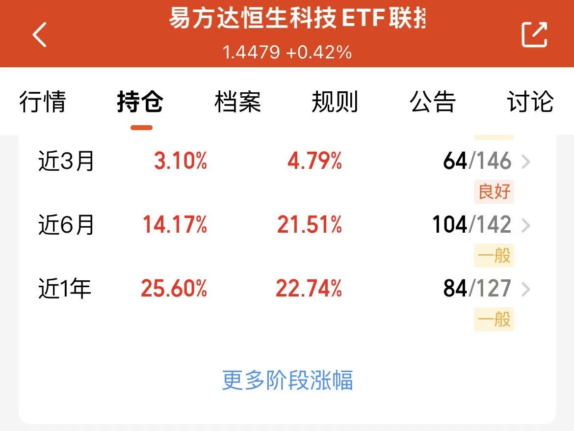 今天A股和港股都迎来反弹啦,盘面相当的给力,恒生科技指数今天上行1.18%,今天坐等吃肉啦。$易方达恒生科技ETF联接(QDII)C(OTCFUND|013309)$我最近一直在坚持逢低定投,我觉得美联储降息周期下,港股科技弹性强,修复快,再加上业绩也优秀,近六个月涨幅14.17%,长期是继续看涨的!