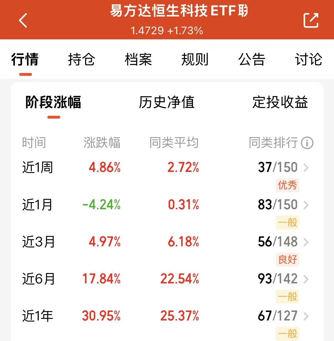 今天A股和港股都继续反弹了,恒生科技也是迎来上涨了,美联储10月底降息也临近了,利于港股市场外资回流,$易方达恒生科技ETF联接(QDII)C(OTCFUND|013309)$近一周涨幅4.86%,近六个月涨幅17.84%,近一年涨幅30.95%,是聚焦港股30家科技龙头的,持仓覆盖AI、电商、半导体等等热门赛道,补涨几率大,我继续看好这个方向了。