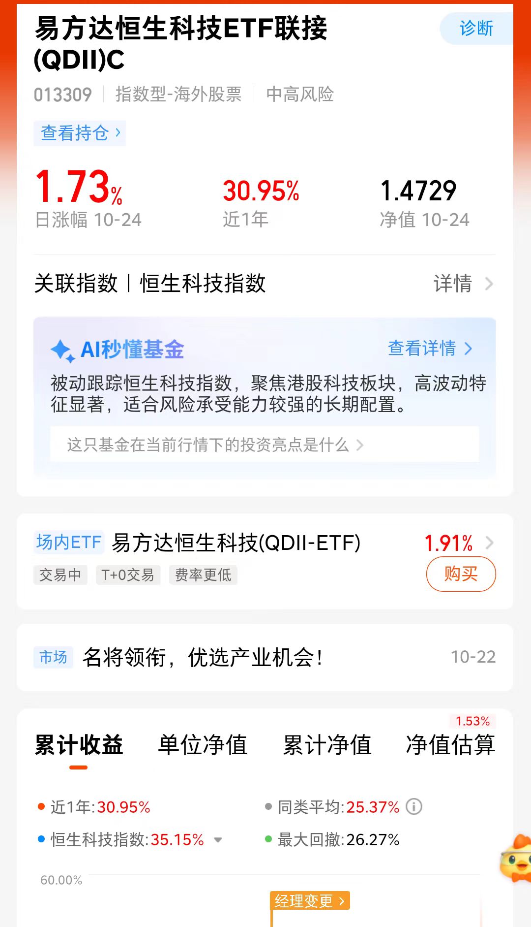 友友们,今天股市反弹行情继续,牛市行情反弹还是比较快的。美联储10月底降息临近,我觉得可以关注港股外资回流力量;尤其是港股科技与A股科技相比涨幅有差距,成分股业绩扎实,可以关注$易方达恒生科技ETF联接(QDII)C(OTCFUND|013309)$补涨机会