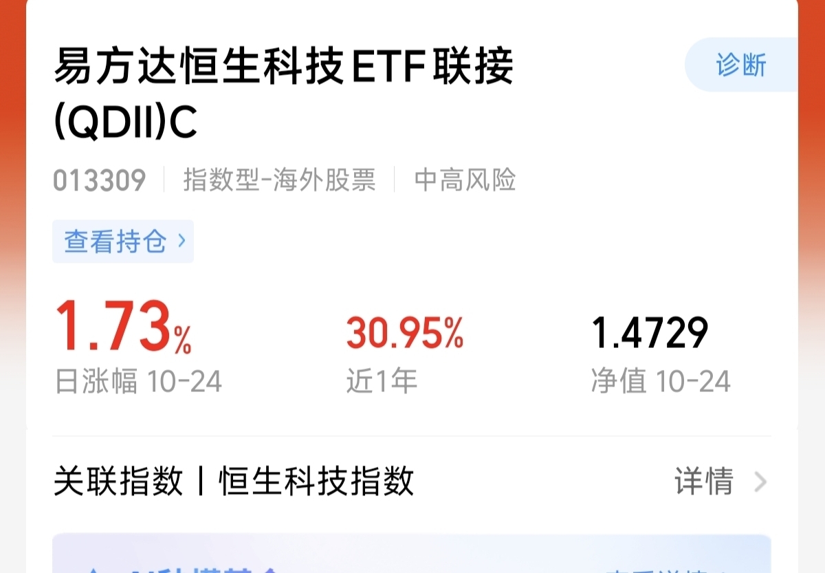 确定了,今天大盘创出了新高。可是港股还没怎么涨。随着本月美联储打开降息空间,有望再度带动港股的爆发。今天我继续布局持有的$易方达恒生科技ETF联接(QDII)C$ 紧密跟踪恒生科技指数。跟踪的精准度高。周五上涨了1.73%。近一年涨幅30.95%。同类长期做到了优秀。看好本轮继续突破。