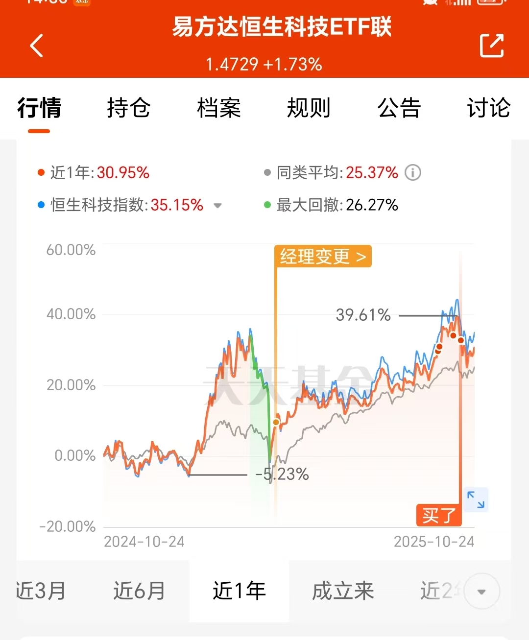 $易方达恒生科技ETF联接(QDII)C(OTCFUND|013309)$紧密跟踪恒生科技指数,近1年涨30.95%,表现不错。当前恒科正值上升趋势,性价比突出,我今日继续布局,静待反弹行情。