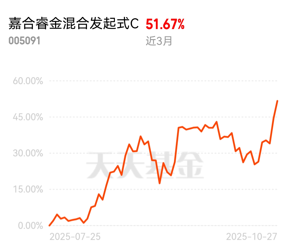 海外资金加仓半导体,重点瞄准CPO和存储芯片,行情内外联动。嘉合睿金混合C精准踩中,1周20个点,近3个月51.67%,收益很亮眼。