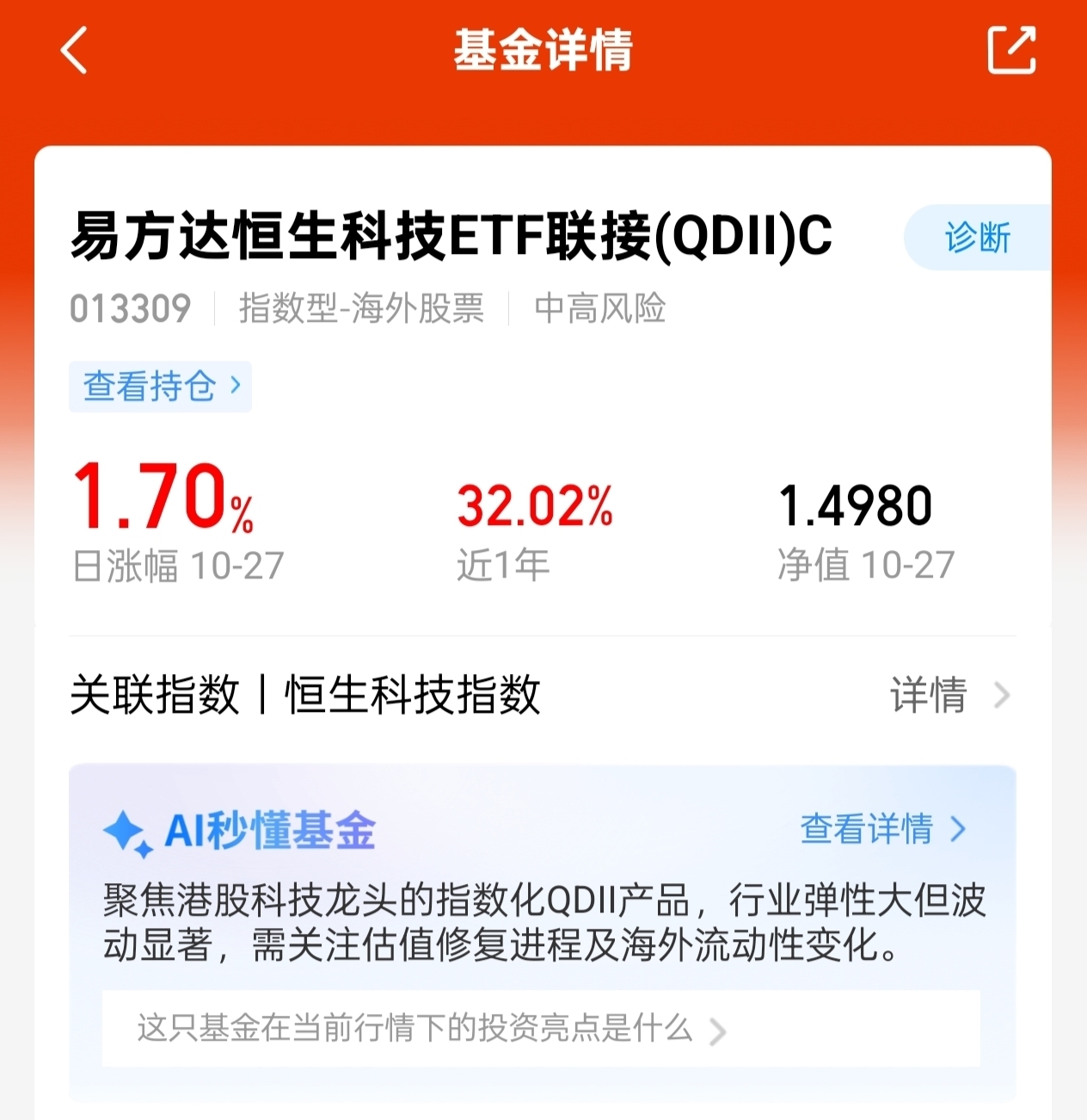 今天市场出现调整,我觉得挺正常的,毕竟前面涨了不少,适当回调反而更健康。四季度我比较看好港股科技板块的机会,特别是随着美联储可能降息,外资回流预期增强。我关注的$易方达恒生科技ETF联接(QDII)C$ 管理费只有0.31%,在同类产品中算比较低的。