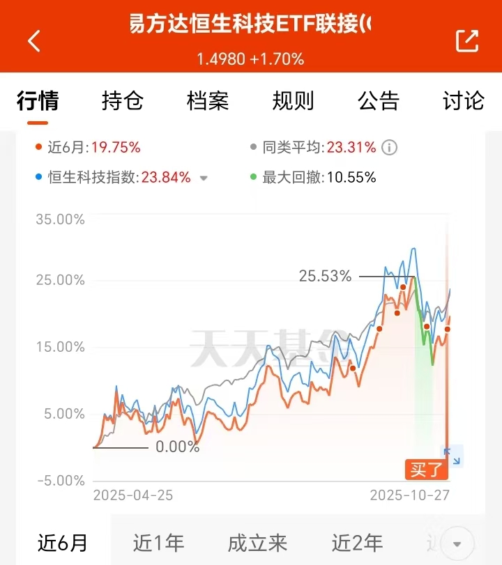 $易方达恒生科技ETF联接(QDII)C(OTCFUND|013309)$近半年涨了19.75%,综合费率才0.31%,比市场上常见的0.8%、0.9%划算不少。当前恒科在上升趋势里,逢低布局正合适。#A股盘中突破4000点!下个目标位在哪?#