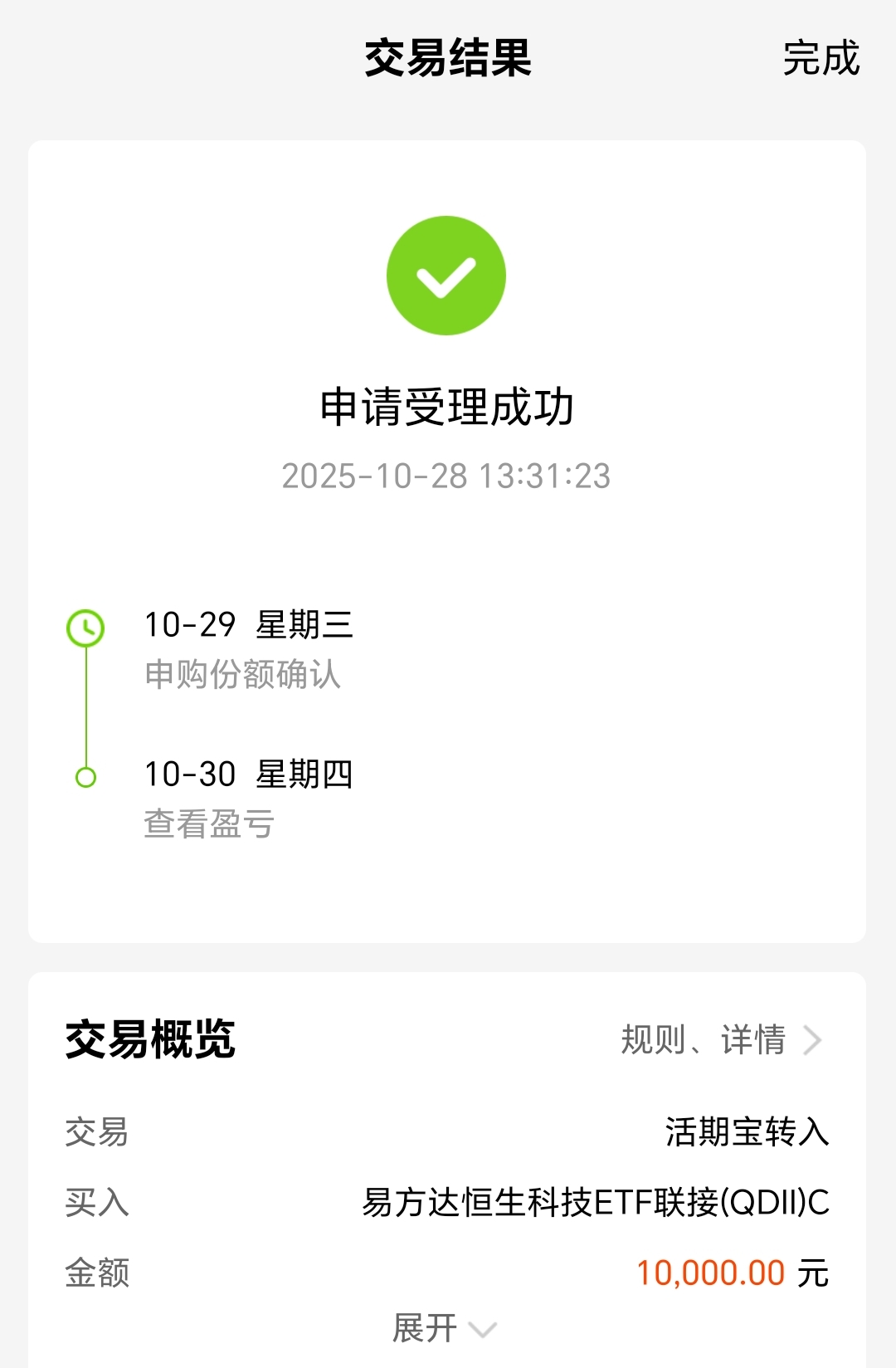 今天趁着小幅回调,我逢低入场$易方达恒生科技ETF联接(QDII)C(OTCFUND|013309)$,有的恒生科技限购了,但是易方达这只还没限购,费率比较低,像是A类综合费率0.31%,同类产品都0.8%、0.9%。它昨天涨1.7%,近1年收益率涨超32%,弹性不错,我继续看好。