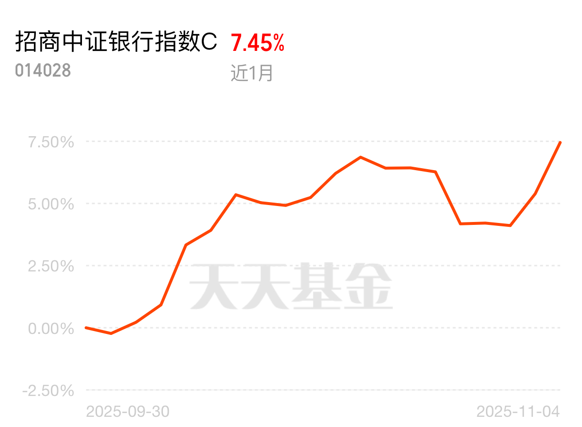 市场里高股息标的的选择得精准,港股无风险收益率4~5%,境内还不到2%,A股银行是优选。招商中证银行指数C近1个月涨了7.45%,跟上这波机会不亏。