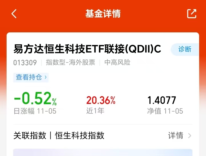 $易方达恒生科技ETF联接(QDII)C(OTCFUND|013309)$紧密跟踪相关指数,近半年涨10.44%,当前企稳反弹,我觉得是个不错的入场机会。#4000点 到底要不要止盈?#