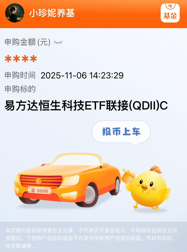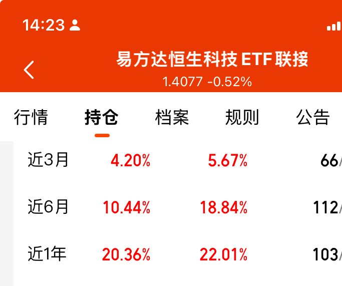 目前对于港股,它一直滞涨我一直观望,结果恒科跌回9月初的位置了,目前整体趋势下影响因素可控,且南向资金仍然在持续流入,再说目前这个点位的配置性价比不错,打算继续上车!$汇添富港股红利ETF联接C(OTCFUND|501306)$$海富通中证港股通科技ETF发起联接C(OTCFUND|021465)$#4000点 到底要不要止盈?#