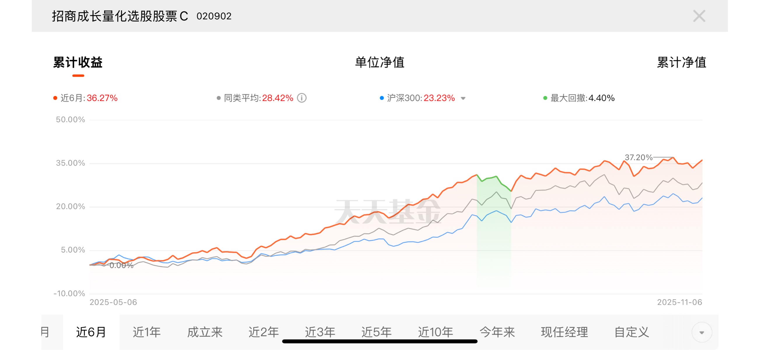 股市里靠谱的基金不多,招商成长量化选股股票C算一个,近6个月涨36.27%,近一
