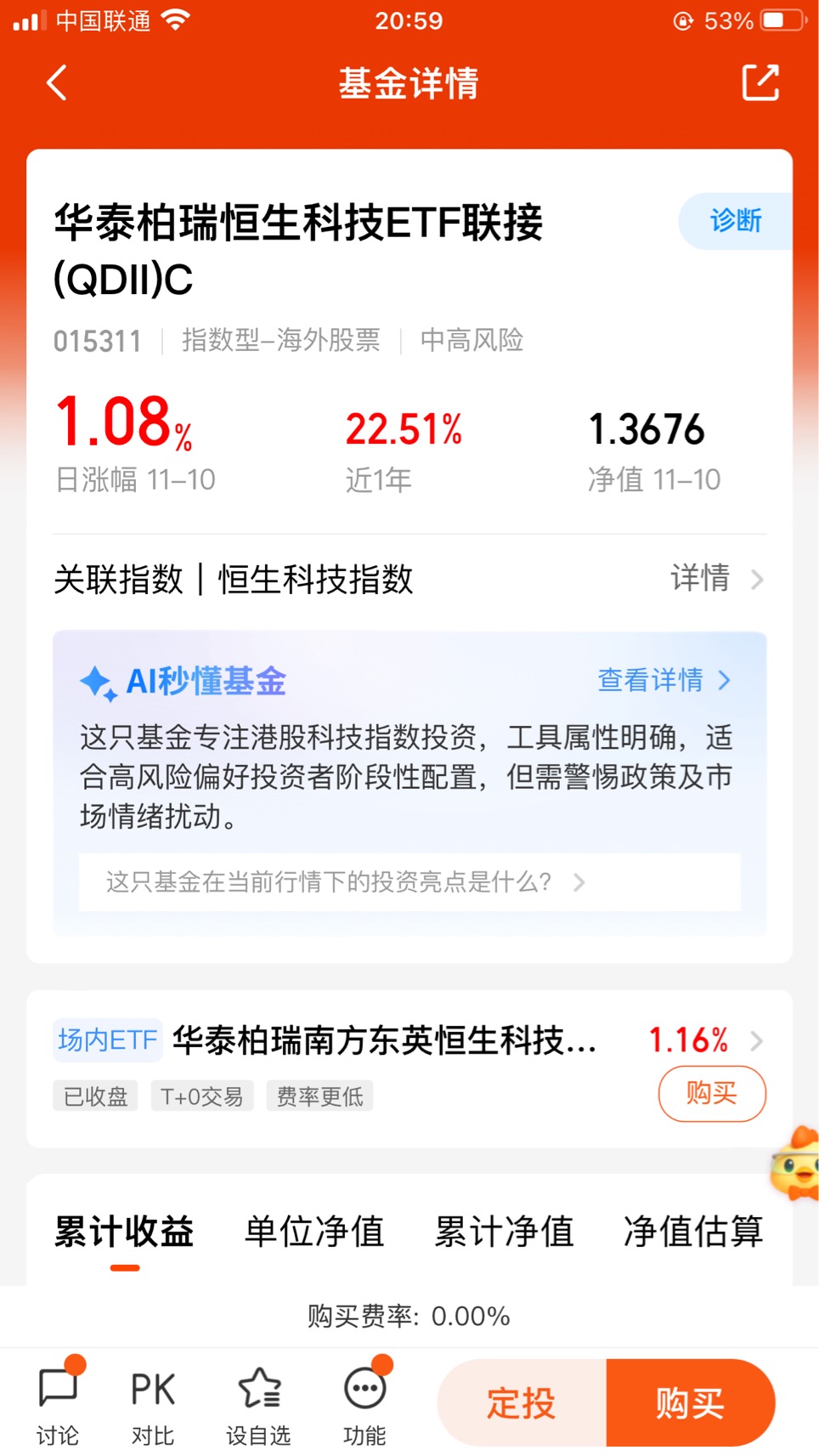 今天恒生科技可算扬眉吐气了!美国政府重新开门,港股总算是能企稳了,板块今天直接涨起来。我手里盯着的华泰柏瑞这只基,今天也跟着涨了1.08%,近一年都涨了22个多点。这基其实就是跟着恒生科技指数走的,想买港股科技股又嫌选股麻烦的,买它就对了,工具属性特别明确。不过得提醒哈,这是中高风险的,不能只看收益,波动也得扛得住,现在行情稳了,想布局港股科技的,华泰柏瑞这只确实是个省心的选择~$华泰柏瑞恒生科技ETF联接(QDII)C$ #大消费板块逆市拉升!行情能否持续?#