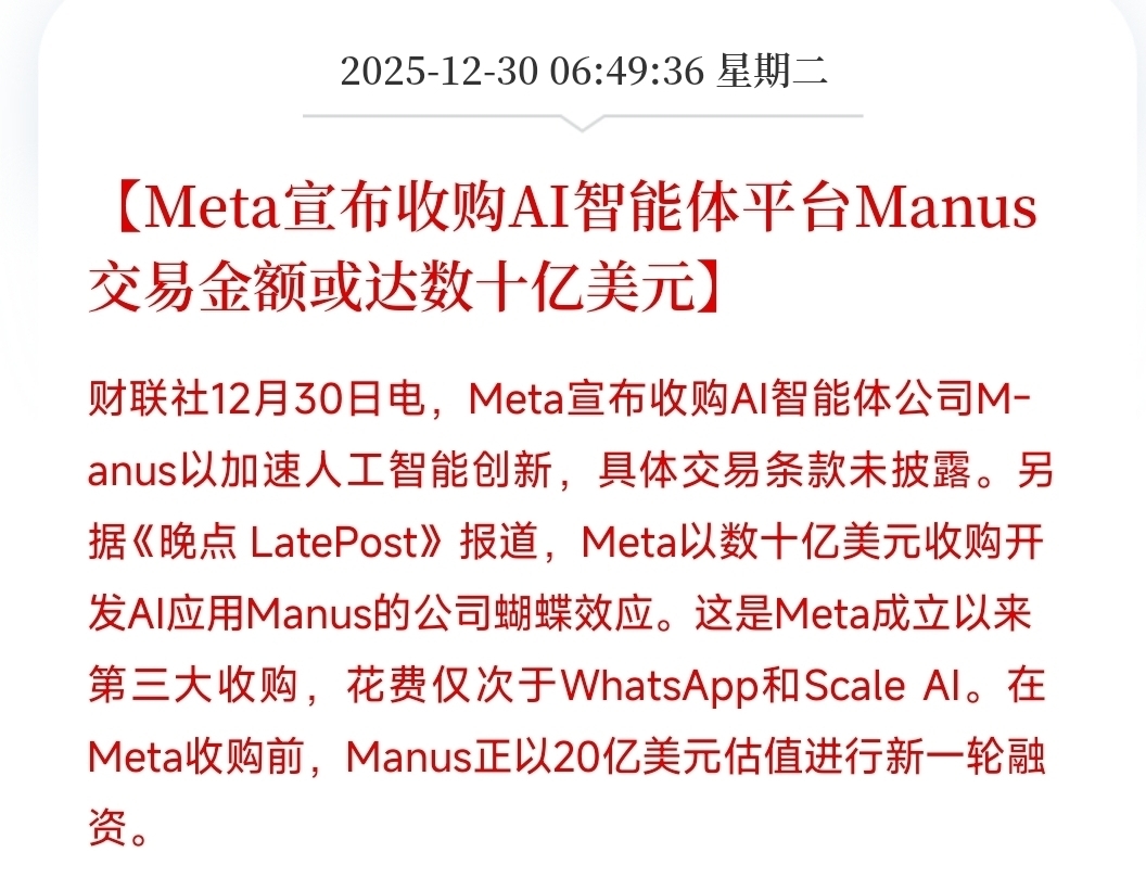 科技有大大大事,美股巨佬Meta用数十亿美元收购中国人工智能企业Manus,这家