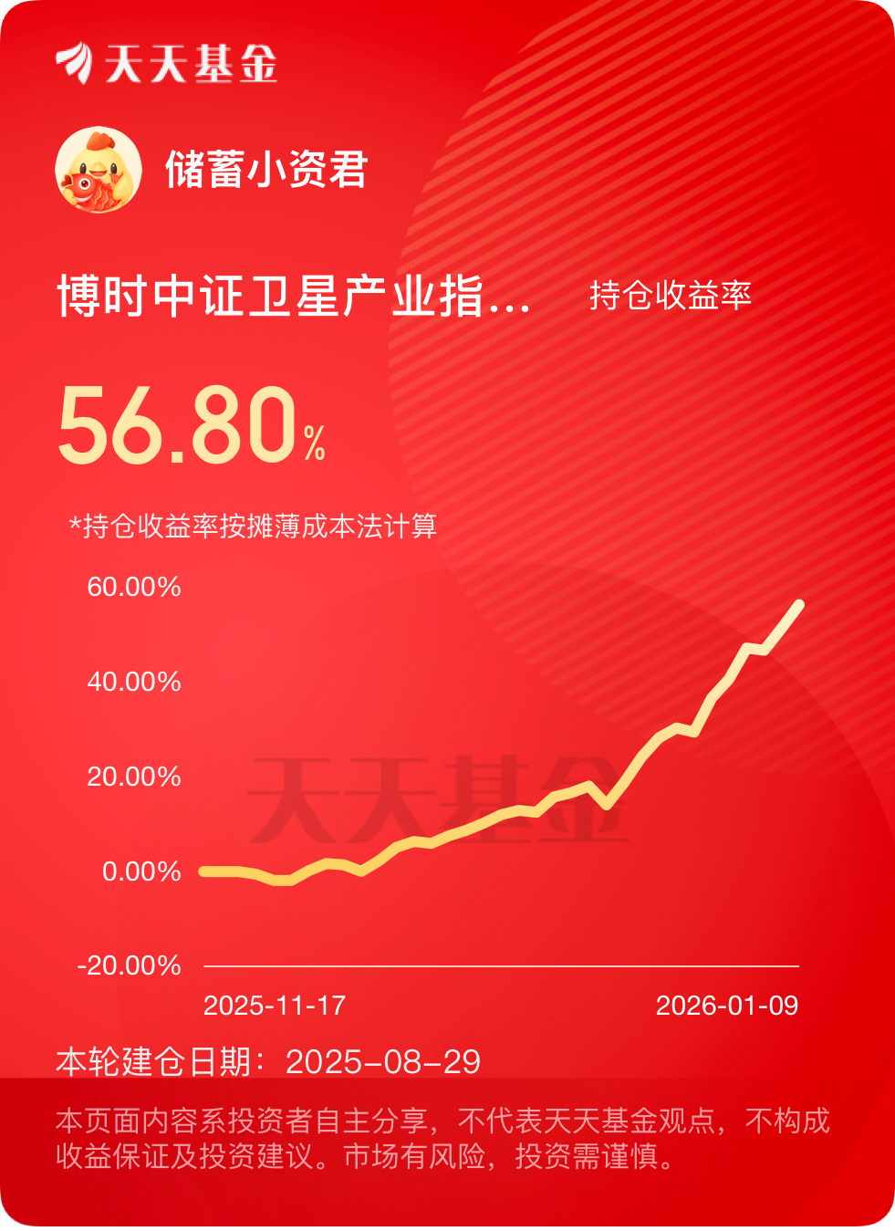 盘点2025年的投资战绩,超额收益的关键词必须是$博时中证卫星产业指数C$ !虽然这只基去年才成立,但给我的惊喜直接拉满,近一个月涨幅47.53%,把沪深300全年17.66%的涨幅甩了一大截,就连我拿了大半年的半导体基金,收益都远远比不上它。之前踩过不少主题基的坑,要么跟踪误差大,跟不上板块节奏,要么涨得慢跌得快,拿在手里纯纯闹心,这只基却完全不一样,精准贴合卫星产业走势,持仓全是板块核心龙头,同类排名一直稳居前列。当初就是抱着试水心态买了一小笔,没想到直接成了去年收益最高的投资,也让我彻底认准卫星赛道的潜力,2026年肯定会继续坚定持有。#2025超额关键词#