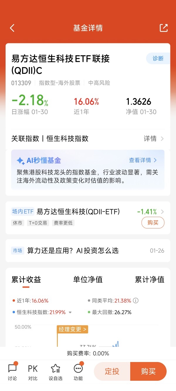 我2025年最得意的操作,集中在易方达恒生科技ETF联接(QDII)C (013309) 上。过程并不复杂: