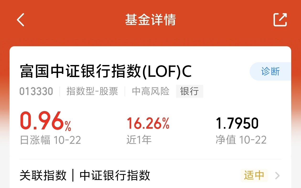 我也是加仓了$富国中证银行指数(LOF)C$ +1000元,基金近期表现的也是非常的出色,近一个月上涨了5.77%,近六个月上涨了7.29%,近一年的收益率高达16.26%,盈利能力强。基金精准的跟踪中证银行指数,抗波动能力强。随着银行营收、净利润持续增长,资产质量持续优化,不良贷款率环比下降,银行业绩持续改善。将迎来新一轮的上涨。叠加银行中期分红,吸引大批量的资金顺周期流入。长期持有,投资回报率高,期待后期收益。