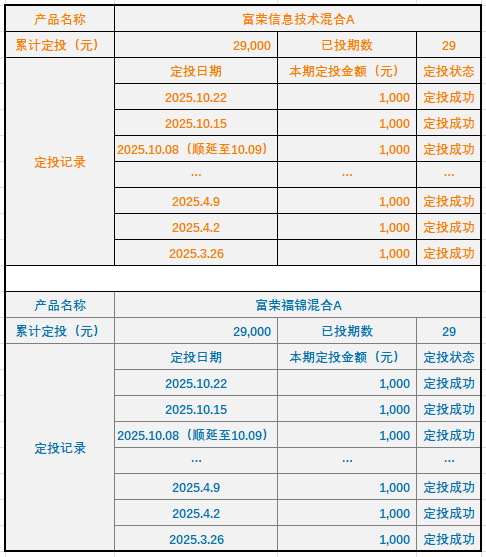 大家好!我是富荣信息技术混合、富荣福锦混合的基金经理李延峥。我于10月22日定投买入富荣信息技术混合A、富荣福锦混合A两只产品各1000元。