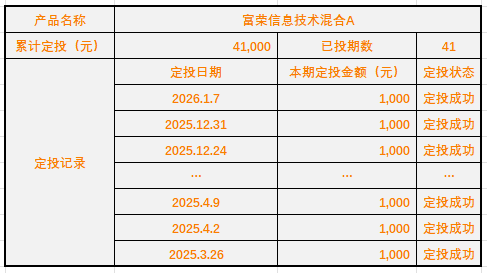 大家好!我是富荣信息技术混合的基金经理李延峥,感谢大家一直以来的关注与支持,2026年我将继续定投,当下仍重点关注AI应用领域。我于2026年1月7日定投买入富荣信息技术混合A 1000元。