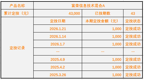 大家好!我是富荣信息技术混合的基金经理李延峥,感谢大家一直以来的关注与支持,本周我于2026年1月21日定投买入富荣信息技术混合A 1000元。