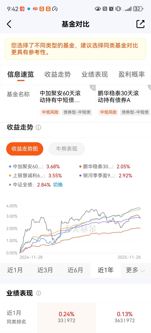 年底感觉股市有点摇摆,加点防御资产增加些安全垫,长债感觉消息面扰动太多,利空因素大于利多,整点中短债确定性强些,然后对比了几只热门中短债基,觉得$中加聚安60天滚动持有中短债发起式A$ 性价比更高些,一是持有收益率更强,二是即使遇到市场回调,修复速度和幅度都比较优秀。不想选太稳的类余额宝产品,蚊子腿也是肉,有点超额收益更好!