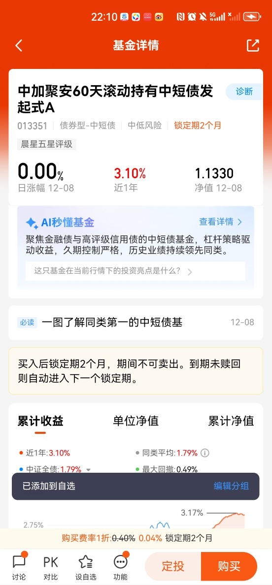 以$中加聚安60天滚动持有中短债发起式A$ 为例,其近1年/3年收益率达3.59%/12.15%,显著跑赢业绩基准。该产品通过严控久期(如2.5年内)和精选高评级信用债,在降低利率风险的同时获取票息收益,符合“防守优先”原则。