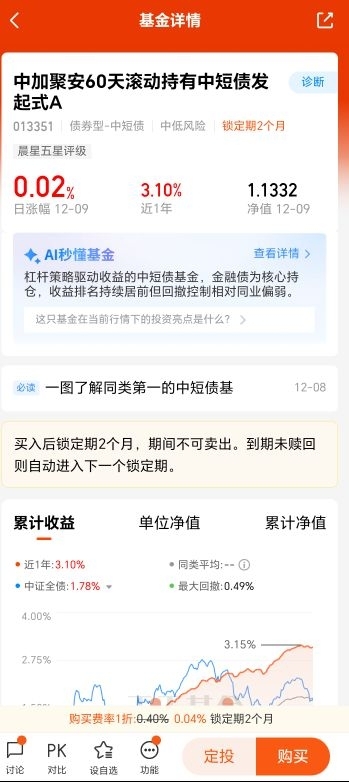 #年末如何防守反击# $中加聚安60天滚动持有中短债发起式A$ 我选中加聚安60天滚动持有中短债发起式A来分享~今天大盘波动还挺明显的,股基多少有点震荡,但短债类产品基本稳住了节奏——毕竟年末资金面偏紧+市场情绪反复,像中加聚安这种中短债,本身久期灵活、风险可控,刚好能接住“不想承受波动又想赚点收益”的需求。